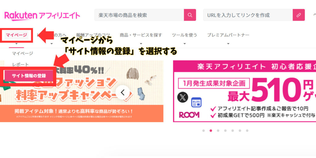楽天アフィリエイトIDとの連携が完了したら、忘れずに楽天アフィリエイトでのサイト登録も行います。